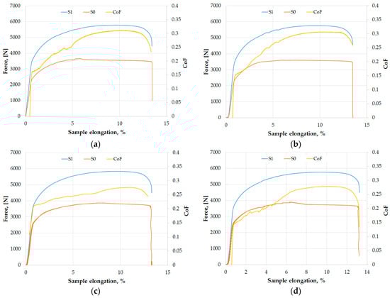 Influence of the type of countersamples on the back-tension force (S0), front-tension force (S1) and CoF for (a) C-EBM, (b) C-U, (c) C-Pb-EBM and (d) C-Pb.