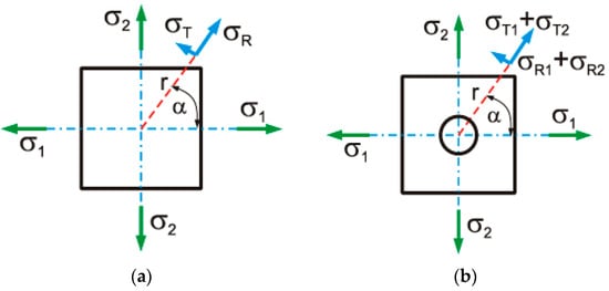 The stresses σR1 and σR2 and σT1 and σT2 as a function of the stress components σ1 and σ2 are defined using the Kirsch equation derived for the elastic stresses around the central hole in an infinitely large disc. The unit strains caused by changes in the stress components within the limits of Hooke’s law are defined from the following relations: