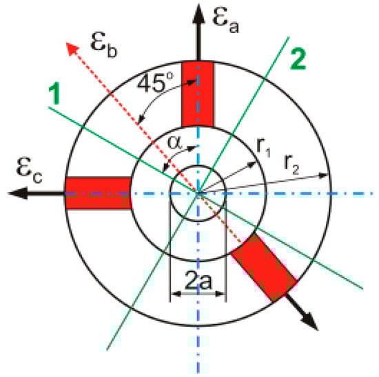 In Equation (14), there are three unknowns: σ1, σ2, and α. In order to determine them, a system of three equations should be created. They are solved based on the results of strain measurements in three radial directions (Figure 18). Using a three-element rectangular rosette with measurement directions ωa = 0, ωb = +45°, ωc = 90° (α is the reference measurement direction), the solution of the Equation (14) provides the following: