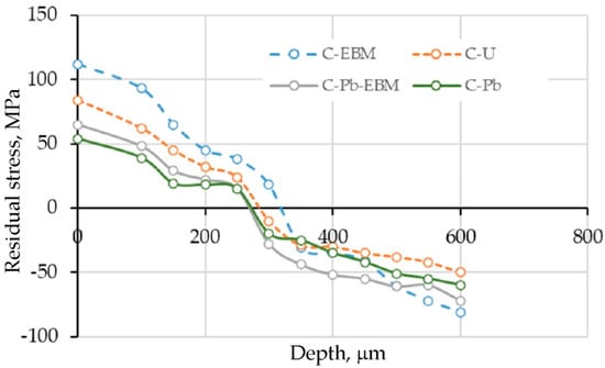 For all analysed surface modifications of countersamples, similar trends were observed regarding the distribution of residual stresses in the considered depth range (0–600 μm). Tensile residual stresses occur in the vicinity of the sheet surface. These stresses decrease with the change of depth and transform into compressive stresses at a depth of around 300 μm. The highest tensile stress was recorded for the C-EBM countersample, the value of which is about 112 MPa (Figure 19). The highest compressive residual stresses of about 80 MPa were also observed for the C-EBM countersample. On the other hand, the lowest values of both compressive and tensile residual stresses were found for the C-Pb countersample. It was observed that CoF has a significant effect on the distribution of residual stresses in the analysed process.