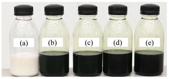 Prepared oil samples: (a) soluble oil, (b) cactus oil in its plain form, (c) cactus oil with 0.025 wt.% ACNPs, (d) cactus oil with 0.05 wt.% ACNPs, and (e) cactus oil with 0.1 wt.% ACNPs.