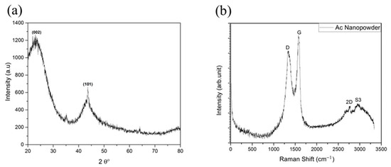 The purity of AC is mainly dependent on the material type of plastic waste and the pyrolysis process itself [61]. Hence, a scanning electron microscope (SEM) (JEOL JSM-IT200, JEOL Ltd., Tokyo, Japan) and transmission electron microscope (TEM) (JEOL JEM-2100, JOEL Ltd., Tokyo, Japan) were used to evaluate the structural properties, particle size, and morphology of the synthesized ACNPs. Moreover, the analysis of microstructural phases and the degree of crystallinity was carried out through the examination of characteristic peaks of AC powder using X-ray diffraction (XRD) spectroscopy (Empyrean Malvern Panalytical, Almelo City, The Netherlands). XRD patterns are acquired at 40 keV and 30 mA utilizing Cu-Kα1 radiation. To assess the quality of the nanostructure, the functional groups of AC composition were investigated using the Bruker Vertex 70 Fourier-transform infrared (FTIR) spectroscope (Bruker Company, Billerica, MA, USA) with a detection range spanning from 400 to 4000 cm−1. The structural flaws of AC were attained via Raman spectroscopy (WITec alpha 300 R, WITec Wissenschaftliche Instrumente und Technologie GmbH, ULM, Germany). The examination commenced by subjecting the rGO specimen to 3 mW power with an applied laser wavelength of 532 nm. Subsequently, the ultimate spectrum was recorded and exhibited within a 20 s detection period. Brunauer–Emmett–Teller (BET) at −200 °C (Belsorbmini II, BEl Inc., Osaka, Japan) was applied to obtain an estimation of the surface area of the ACNPs.