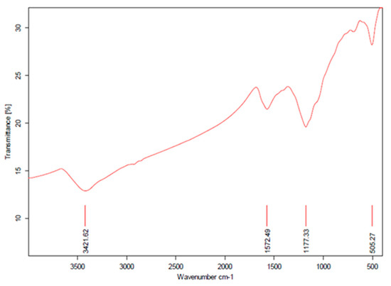 The XRD patterns (Figure 4a) show broad peaks at 2θ ≈ 21–23° (002 plane) and 43.2° (101 plane), confirming the amorphous nature of AC derived from PET waste. Raman spectroscopy (Figure 4b) further validates the structure with distinct D (1348 cm−1) and G (1590 cm−1) bands, signifying lattice defects and C=C stretching, respectively. Minor 2D (2680 cm−1) and S3 (2844 cm−1) bands suggest few-layered carbon domains. FTIR spectra (Figure 5) reveal key functional groups. The peak at 3421.62 cm−1 confirms the presence of O–H stretching (hydrogen-bonded alcohols/phenols), while the peak at 1572.49 cm−1 belongs to the C=C aromatic ring vibrations. The other peaks at 1177.33 cm−1 and 506.27 cm−1 are indicative of C–O stretching and aromatic ring deformations, corroborating the carbonaceous structure.
