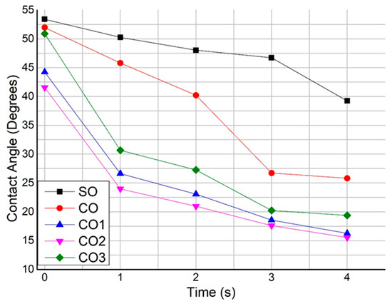 The molecular structure and nano-additives are two factors that define the surface tension of the oil. Figure 6 and Figure 7 show the measured CA of cactus oil samples as well as the soluble oil. It is observed that the recovered CA decreases gradually over the test time until it reaches a steady state after 4 s. Plain cactus oil reached a contact angle of 25.81°, while the soluble oil exhibited the largest CA value of around 39.24°. The addition of ACNPs at different blends to the cactus oil enhanced the physical adsorption between the oil and the contact surface. In the case of the CO2 sample, the CA was improved by up to 40% and 60% in comparison with CO and commercial SO, respectively. The wettability results of Vasco 6000 and Zubora 67H from a previous investigation [49] are used for comparison. Both emulsions showed good droplet dispersion over the surface, exhibited by contact angles of 27° and 14°, respectively, which is attributed to their chemical composition such as carboxylic acid and alkanolamides to enhance the dispersal of oil in water. The results in general indicate comparable wettability of cactus oil blends with ACNPs to Zubora 67H and Vasco 6000 oils [49], i.e., effective spreading of cutting fluid is attainable in the secondary shear zone during cutting operation.