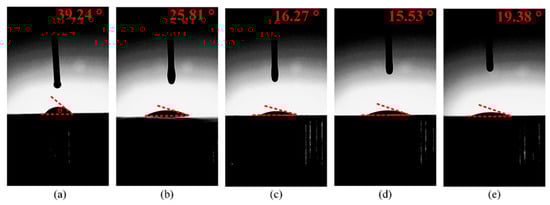 One crucial characteristic of an effective cutting fluid for reducing friction is wettability. Surface tension is the controlling factor of the contact angle (CA) and hence the wettability of the oil samples on the cutting tool surface. It is generated as a result of the surface molecules of the oil drop being pulled by cohesive forces inwards to the center, leading to a spherical shape with the minimum surface area possible. The wettability test of oil samples was conducted using a contact angle goniometer. During each test, a droplet of the cutting fluid was released from a syringe onto the steel work surface, while the monochrome CCD camera captured an image of the droplet. The image was then processed to calculate the CA using the associated software.