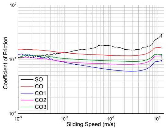 The CO2 sample achieved a significant reduction in friction, approximately 32% compared to CO, although its COF remained similar to that of SO up to a speed of 2 × 10−3 m/s. From 6 × 10−3 m/s onward, the CO1 sample began to exhibit a decreasing trend in COF, indicating a transition from the boundary to the mixed lubrication regime and resulting in the lowest friction values observed. An earlier transition from boundary to mixed lubrication was also noted in the CO samples compared to SO.