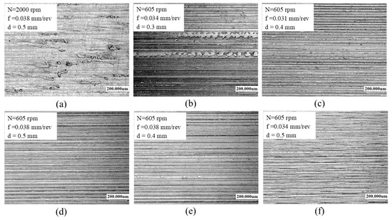 Machined surfaces of the workpieces using the tested lubricants and lubrication techniques: (a) dry lubrication, (b) soluble oil (SO), (c) plain cactus oil (CO), (d) cactus oil with 0.025 wt.% AC (CO1), (e) cactus oil with 0.05 wt.% AC (CO2), and (f) cactus oil with 0.1 wt.% AC (CO3).
