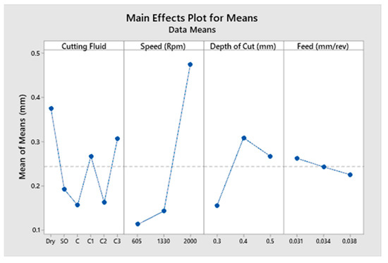 According to the main effects plot for means (Figure 10), the application of SO reduced the mean surface roughness by 15% compared to dry machining. The surface roughness in the case of SO ranges between 1.98 and 2.76 µm, as shown in Table 6. The optimum conditions that achieved the lowest roughness were found at 2000 rpm, 0.5 mm depth, and 0.031 mm/rev feed. SO’s emulsion properties improved cooling and chip evacuation, reducing the severity of BUE and abrasive wear mechanisms. However, its performance lagged behind cactus oil blends due to inferior boundary lubrication from mineral oil’s shorter hydrocarbon chains, which provide weaker adsorption on metal surfaces compared to the long-chain fatty acids in vegetable oils [25]. This is shown in Figure 11b by the presence of deeper feed marks and tearing marks due to insufficient lubrication.