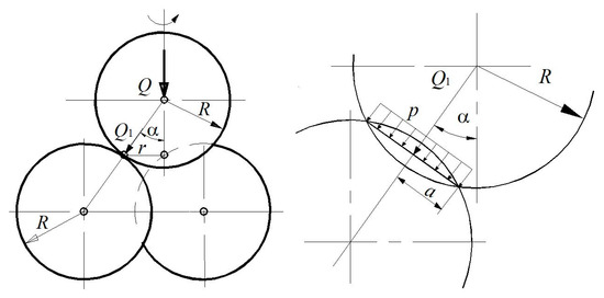 The upper ball 4 rotates and is pressed in the center towards the lower balls with a force Q. The presence of the ball cage ensures the stable, stationary position of the lower balls under vertical load and rotation of the upper ball with a moment around the vertical axis. This simple stable system of four balls, the centers of which form a tetrahedron, is widely used as a scheme for tribological studies, with oils poured into the space between the balls. In the process of the friction of the upper ball on the lower ones, wear areas of a circular shape are formed on them. To determine the normal component of the force Q1 on the lower balls, it is necessary to determine the angle α: