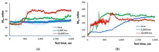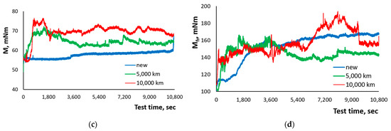 These measurement results show that for a shorter test time, the lowest value and most stable friction torque are demonstrated by the new oil at a lower loading, but the increase of the loading to 300 N causes instability and higher values of friction torque in time when using the new oil (Figure 2b,d). The tests at a lower loading (150 N) show the comparably stable friction torque of all three tested versions of oil, with the highest friction value of the long-term-operated oil (Figure 2a,c) that passes the process of the loosing of lubrication properties of oil because of its aging and increasing acidity. However, at a higher loading the friction behavior of oils changes. The friction torque value of the new oil reaches the values of used oils in the short term, and during the longer tests its advantage is only in the stability of friction torque. The most unstable friction torque shows in the oil which was used the longest. The longer operation of the tested oils in total causes a higher fluctuation in friction torque at a 300 N loading, and that is related to the lower lubricity efficiency of oils at higher loading.