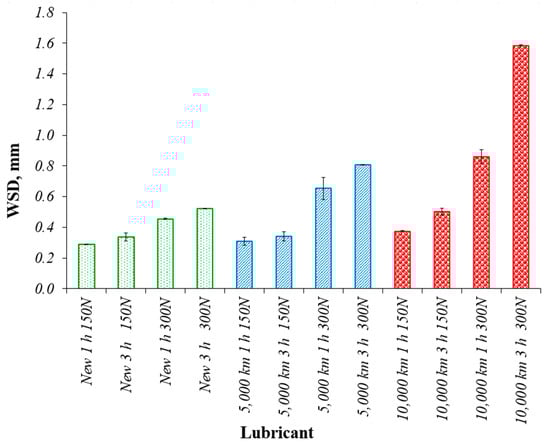 It is also important to pay attention to oil acidity changes during operation for the long-term operation modeling of engine oils’ wear behavior. A monitoring of acidity indicators could be applied for this [40]. Another important factor to be considered in future—the influence of the lubricant additives aging on the lubricant efficiency. The performed investigations show that the additive’s capability to modify the surface is most efficient for fresh lubricants, and with the aging of lubricants the surface saturation with active components is reduced [41].