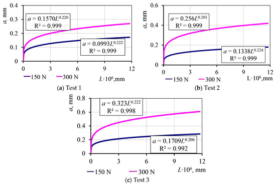 Wear tests in the four-ball scheme allow for the variability in the dimensions of the contact (wear) area during the tests and, accordingly, the contact pressure during the wear process. When testing one sample, it is possible to obtain a function of the dependence of wear on the friction path for the range of contact pressures. This feature is taken into account in the calculated dependencies (Equations (7)–(9)). The obtained coefficients consider the effect of changes in contact pressure on wear (external load is included in the formation of pressure).