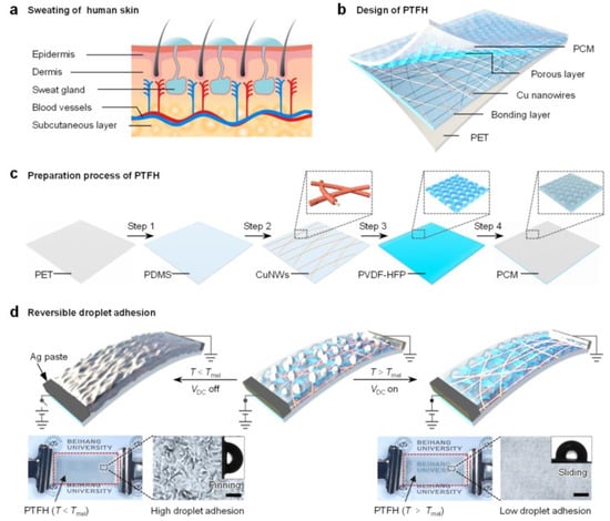 To address this gap, we draw inspiration from stimulus-responsive biosecretion mechanisms. As shown in Figure 1a, when the environmental temperature increases or the human body experiences stress, it is widely recognized that the skin secretes sweat, modulating the frictional force on its surface [28,29]. This natural mechanism serves as a paradigm for the design of a phase-change transparent flexible heater (PTFH). As depicted in Figure 1b, the PTFH comprises a polyethylene terephthalate (PET) support layer, a polydimethylsiloxane (PDMS) bonding layer, copper nanowires, a poly(vinylidene fluoride-co-hexafluoropropylene) (PVDF-HFP) nanoporous layer, and infused phase-change materials (PCM).