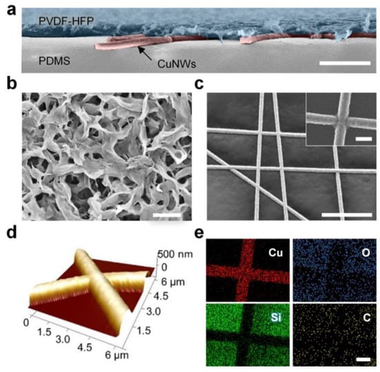 Figure 2e presents the energy-dispersive spectroscopy (EDS) elemental mapping of CuNWs on the PDMS adhesion layer. The homogeneous copper distribution and the absence of oxygen signals indicate excellent atmospheric stability without significant oxidation. This conclusion is corroborated by the CuNWs’ EDS spectrum (Figure S4, Supplementary Materials).