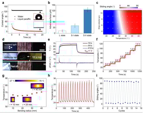 The temperature rise curves of the PTFH surface under different voltages are displayed in Figure 3f. The surface temperature increases with VDC; at 0.2 V, the temperature rises by 5.4 °C, while at 1.4 V, it increases from 23.3 °C to 113.5 °C. Adjusting VDC allows for surface temperature control by Joule’s law. At just 0.5 V, the PTFH surface transitions from solid to liquid within 2 s. Figure 3g illustrates the material’s temperature changes at various angles, demonstrating excellent bending resistance (Figure S6, Video S1, Supplementary Materials). Figure 3h shows 15 periodic heating and cooling curves at 0.4 V, indicating rapid response and cyclic stability. Figure 3i confirms the material’s outstanding periodic stability for reversible droplet SA transitions under input voltage.