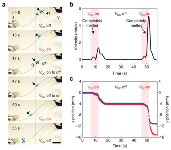 Figure 4a shows a droplet sliding along a highly curved S-shaped PTFH surface. At 0 s, the droplet is held in place at position A on the surface of the PTFH, and the tilt angle is 41°. When a VDC is applied, the paraffin on the material’s surface melts. After about two seconds, the droplet slides, and the rate of sliding increases with the increase of the bending angle. When VDC = 0, the sliding droplet slows down and stops at position B (tilting = 47°) within 1 s. The pinning of droplets results from forming a ring ridge around the droplet, which enhances the SA of the droplet. The droplet resumes moving and eventually reaches position C as the VDC is applied again (see Video S2, Part 1, Supplementary Materials). Figure 4b,c shows the droplet’s x- and y-axis displacement corresponding to Figure 4a along the s-shaped curved PTFH surface and the change curve of velocity with time.