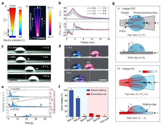 To highlight the advantages of the V-PTFH in laterally controlled droplet transport, we compare the PTFH with a traditional V-shaped SLIPS surface (with a lubrication layer of liquid paraffin and a porous layer made of PVDF-HFP, referred to as SLIPS). As shown in Figure 5e, under the influence of the Laplace force, the maximum transmission speed of droplets on the V-SLIPS surface can reach 2.2 mm/s, with a maximum transmission distance of 10.1 mm. In contrast, the maximum speed of droplets on the V-PTFH surface is ~1.9 mm/s. However, droplets can be transmitted over a longer distance (13.94 mm), and the starting and ending points of droplet transmission can be controlled by adjusting the input VDC. This indicates that PTFH surfaces can achieve programmable control of liquid droplets compared to ordinary SLIPS surfaces. Additionally, programmable droplet actuation on the PTFH requires only 1 V, which is significantly lower than previous reports (Figure 5f) [22,23,24,25,26].