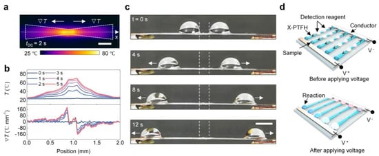 To control multiple droplets on the same surface, we prepared the X-PTFH by clipping. The infrared image in Figure 6a confirms our hypothesis. In Figure 6b, at VDC = 1.5 V, the X-PTFH surface temperature shows symmetrical distribution. The highest temperature reaches 67 °C at the link, while the lowest temperature is 30 °C on wider sides, creating a temperature gradient of up to 12 °C/mm in the opposite direction. This combines temperature and Laplace gradients on the X-PTFH surface. In Figure 6c, at VDC = 1.5 V, two droplets move at 2.3 mm/s toward both sides of the X-PTFH, enabling programmable control of multiple droplets under a single stimulus (see Video S4, Supplementary Materials). Based on these characteristics, we designed a microreactor device for batch reactions of various droplets, as shown in Figure 6d. Additionally, we performed systematic tests on the long-term stability of the PTFH. The results indicated that, using the V-PTFH as an example, its performance did not exhibit significant attenuation after 300 droplet-driven experiments, demonstrating its excellent durability (Figure S8, Supplementary Materials). As a heat-driven technology, the evaporation of droplets can be reduced by sealing the system to minimize evaporation or using liquids less prone to evaporation, such as ionic liquids, for driving [35].