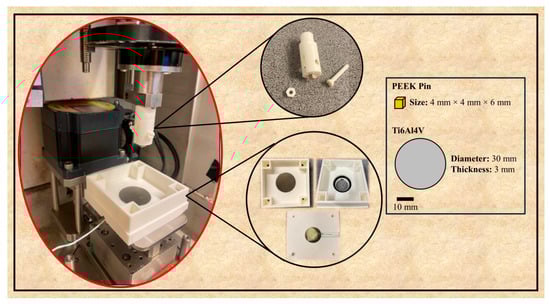 The PEEK samples were fabricated via fused filament fabrication (FFF) in a horizontal build orientation, using a 1.75 mm diameter filament with a dimensional tolerance of ±0.02 mm and a printing speed of 20 mm/s. Pins with a size of 4 mm × 4 mm × 6 mm were then machined from the 3D-printed blocks for tribo-corrosion tests.