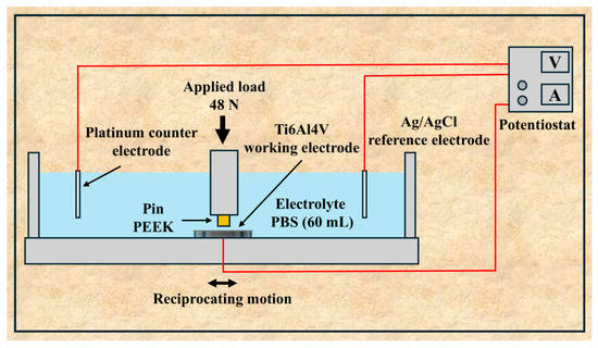 The setup for the corrosion (without and during sliding) and tribo-corrosion tests is presented in Figure 2. For the electrochemical corrosion without sliding, the same cell was used without the pin-holder. A three-electrode cell configuration was used, where the electrodes are in contact with the corrosive PBS electrolyte, and the surface of the sample was horizontally positioned. The Ti6Al4V disk served as the working electrode, a platinum wire electrode was used as the counter electrode, and a Silver/Silver Chloride (Ag/AgCl) electrode was used as the reference electrode. The Ag/AgCl electrode has a potential of 0.199 Volt versus the standard hydrogen electrode when saturated in potassium chloride (KCl), and 242 mV versus the standard hydrogen electrode for the Saturated Calomel Electrode (SCE). The exposed surface area of the sample was approximately 7.065 cm2. The corrosion measurements, open-circuit potential (OCP), and electrochemical polarization were performed at room temperature in 60 mL of PBS salt solution of electrolyte using a potentiostat Autolab PGSTAT302 Echochemie (Metrohm, Herisau, Switzerland). The electrochemical activity was stabilized for 30 min to reach a stable OCP, and then a potentiodynamic polarization test was carried out at a rate of 0.6 mv/s starting at −1.5 V below the OCP up to a maximum of 1 V above the OCP.