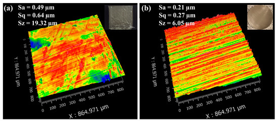 Morphological surfaces images of (a) 3D-printed PEEK and (b) Ti6Al4V before tribo-corrosion tests, obtained by an optical profilometer.