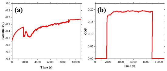 (a) OCP as a function of time before, during, and after the tribo-corrosion reciprocating sliding test conducted on Ti6Al4V alloy against 3D-printed pins in PBS solution, with (b) corresponding to COF.