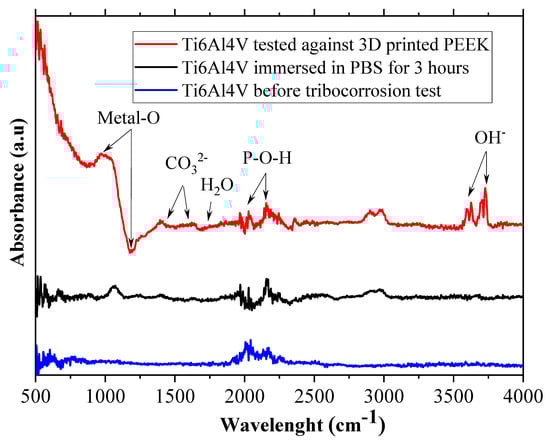 FTIR spectra of Ti6Al4V surfaces before and after tribo-corrosion tests, and after immersion in PBS for 3 h.