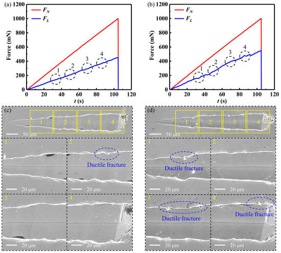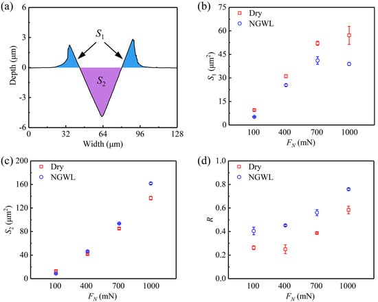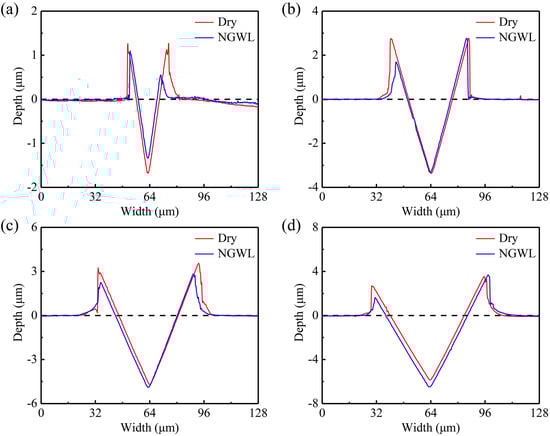- In the single-grain diamond scribing test, NGWL could alleviate the plastic deformation of pure copper, reduce plastic accumulation, and promote ductile fracture. Compared with dry scribing at FN values of 100, 400, 700, and 1000 mN, the material removal efficiency R assisted by NGWL was increased by 54.1%, 80.7%, 44.8%, and 30.3%, respectively.