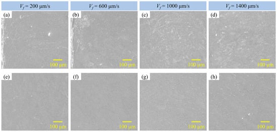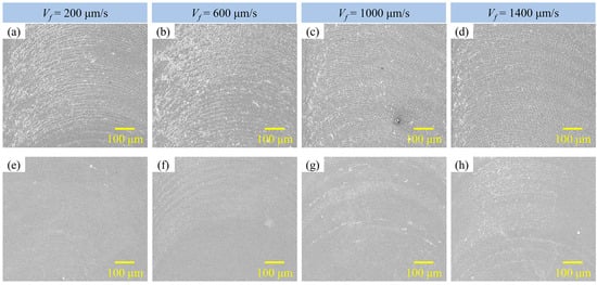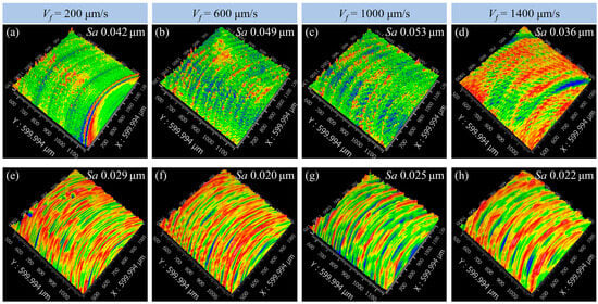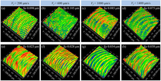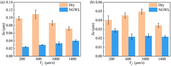 - Compared with dry micro-milling at Vf values of 200, 600, 1000, and 1400 μm/s, for the 75°XT4E tool, the Sa with NGWL-assisted micro-milling was reduced by 75.5%, 73.1%, 61.4%, and 44.2%, respectively. Similarly, for the 65°UDT4E tool, compared to dry micro-milling, the Sa with NGWL lubrication was also reduced by 28.9%, 52.2%, 54.4%, and 36.9%, respectively.