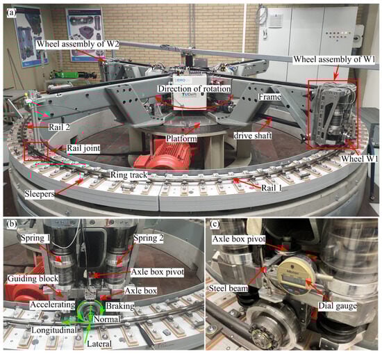 The V-Track test rig consists of a ring track on which a maximum of 4 wheels can roll, as shown in Figure 1a. The ring track comprises four pieces of rails (rail 1, rail 2, rail 3, and rail 4) with the standard S7 profile that are each bent into an arc covering 90 degrees and connected by joints. The rails are fixed onto 100 equally spaced sleepers throughout the circumference of the ring track using fasteners. Rail pads are placed between the rails and the sleepers. To achieve dynamic similarity to the real-life track structure, rubber pads are laid underneath the sleepers to represent the stiffness and damping of the ballast layer. In the configuration used for the present work, only two wheels are present, W1 and W2, as shown in Figure 1a. The scaled wheels are connected to a set of two vertical springs through an axle box and a guiding block. These components constitute the wheel assemblies, as shown in Figure 1b. The springs are compressed to provide the desired vertical forces to the wheel–rail contact and play the role of the primary suspension of a rail vehicle. The wheel assemblies are connected to the platform shown in Figure 1a through a steel frame. A motor drives the platform, pulling the wheel assemblies to travel along the ring track. The direction of rotation is clockwise from a top view (as shown in Figure 1a). Additionally, the wheels are also connected to a second torque motor through drive shafts, which can apply braking or traction torques to the wheels. The AoA between the wheel and the rail can be varied by rotating the wheel and the axle box around the axle box pivot, and is measured using a dial gauge mounted to the guiding block that indicates the distance rotated by a steel beam attached to the axle box, as shown in Figure 1c. The steel beam has a length of 68.45 mm corresponding to a rotation angle of ca. for every 1 mm of the dial gauge reading. For each wheel assembly, a four-sensor piezoelectric dynamometer is placed between the wheel assembly and the steel frame, which measures the wheel–rail contact forces in three directions []. The directions of the measured contact forces and wheel torque are indicated by green arrows in Figure 1b. The wheel rolling speed is controlled to a constant value by setting the rotational speed of the platform in the control software. The braking or accelerating torque applied to the wheel can also be controlled and measured by a torque sensor placed in line with the wheel drive shaft. The torque sensor also has an integrated optical incremental encoder that measures the rotational speed of the wheel. The main technical parameters of the V-Track test rig are provided in Table 1, and a more detailed description of its design and contact force measurement capabilities can be found in [] and [], respectively.