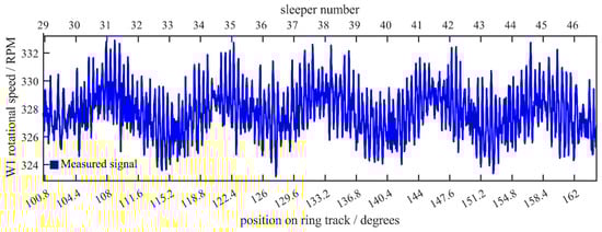 An example of the wheel angular speed measured with the wheel encoder is shown in Figure 2 in the free-rolling condition of Test 2 v8. The bottom horizontal axis represents the angular position of W1 as it rolls along the circumference of the test rig, and the top horizontal axis marks the sleeper numbers. The fluctuations of the signal, i.e., high-frequency variations superimposed on a low-frequency wave, are induced by two types of errors of the optical incremental encoder used for wheel speed measurement: short-term errors (also called differential non-linearities), which manifest as high-frequency random fluctuations in the measured speed signal, and long-term errors (also called integral non-linearities) that are more prominent at lower frequencies [,]. Before the calculation of longitudinal creepage using Equation (4), the wheel speed signal has to be processed to reduce the impact of these error sources.