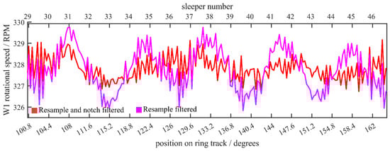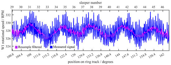 From Equations (9) and (11), is found to be , which is rounded up to . This means that if the wheel rotational speed is measured in an interval of of wheel rotation, the uncertainty of the resultant longitudinal creepage is within the specified limit, assuming that the true wheel angular speed has not changed during this interval. Using this value, a low-pass resampling filter is applied to the measured wheel speed signal. The filtered signal and the original signal are compared in Figure 3, where the reduction in high-frequency variations can be clearly observed.