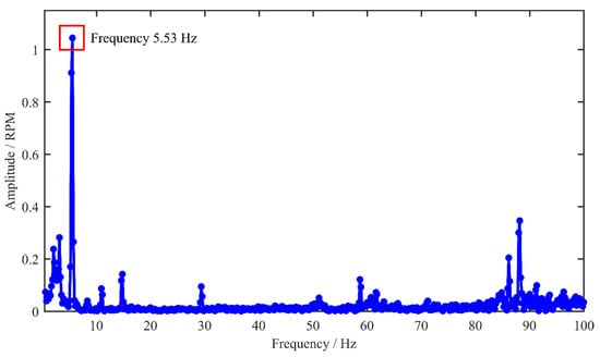 As shown in Figure 3, a low-frequency fluctuation is also present in the measured wheel speed signal. The Fast Fourier transform (FFT) of the resample-filtered signal in Figure 3 is plotted in Figure 4, where we can see that the main contribution is from the 5.53 Hz frequency, very close to the nominal wheel rotational frequency of 5.44 Hz. This can be due to the eccentricity of the encoder mounting []. When the encoder shaft is not completely aligned with the wheel shaft, the centre of the code wheel inside the encoder is offset from the rotational centre of the wheel shaft, causing a periodic disturbance in the measured wheel speed, at the frequency of rotation. To reduce the influence of this error, a notch filter is applied to the filtered signal at the frequency of wheel rotation and its second harmonic. The resultant wheel speed signal is shown in Figure 5, compared to the resample-filtered signal from the previous step (reducing only short-term errors). We may see that the influence of long-term errors is mostly reduced. This notch-filtered signal was finally used in Equation (4) as the measured wheel angular speed to calculate the longitudinal creepage.