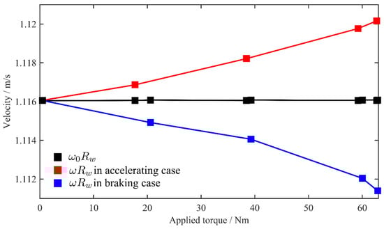 The increase in the calculated longitudinal creepage with applied torque can be visualised in Figure 6, where the average values of are compared to across increasing values of braking and accelerating torques. We can clearly see the increase in slip speed and creepage from the diverging values between and .