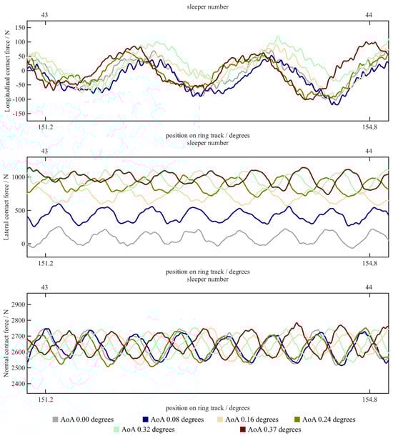 where , , and are the longitudinal, lateral, and normal contact forces. Figure 7 plots the contact forces measured in the lateral creep curve test (Test 1 v8). The last three AoA cases (i.e., AoA = , , and , all beyond friction saturation) were removed to improve readability. The saturation of lateral force can be observed in the final few cases when the , as no increase was observed with a further increase of the AoA. By carefully adjusting the vertical rail alignment along the ring track to within ± 5 mm, the mean value of the normal force, consistent for all the AoA cases, was maintained within 2661.7 ± 20 N. The mean value of the longitudinal force was maintained within 5.7 ± 10 N so that the contact could be considered under pure lateral creepage conditions.