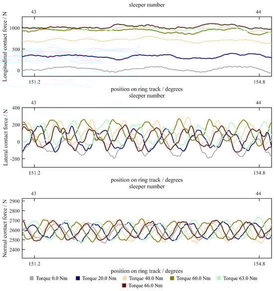 Figure 8 plots the time histories of the contact forces measured in the longitudinal creep curve test (Test 2 v8). The last torque case (i.e., 69 N·m) was removed to improve readability. The saturation of the longitudinal contact force is visible when the torque is over 63 N·m. The mean value of the lateral force was maintained within 66 ± 47.6 N, which at the maximum value was less than 11% of the maximum longitudinal force at saturation. The contact could thus be considered under pure longitudinal creepage conditions.