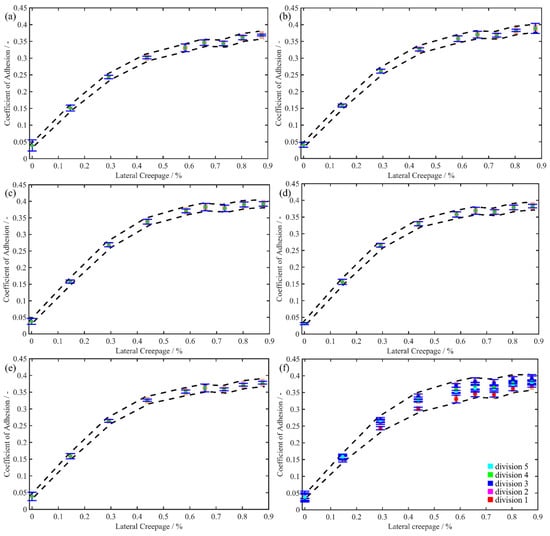 With the processed creepage and CoAs, the lateral and longitudinal creep curves could be obtained for all the test cases in Table 2. To account for any deviation of the CoF along a rail of the V-Track, each rail was divided into five divisions, and the creep curves were plotted for each division. The creep curves were then compared across wheel rolling speed conditions, between the opposite directions of the applied torque, and with the theoretical creep curves obtained from the widely-accepted Kalker’s CONTACT programme []. Finally, the lateral and longitudinal creep curves were also cross-checked, demonstrating the reliability of the V-Track in studying wheel–rail frictional rolling contact.