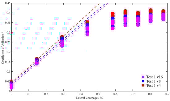 The combined creep curves, i.e., plotted on the basis of the measurement results from all five rail divisions, for Test 1 v4, Test 1 v8, and Test 1 v16 are compared in Figure 10. The uncertainty bounds and error bars were omitted for the sake of legibility. The influence of the wheel rolling speed on the measured creep curves can be identified in two aspects: a slight decrease in the CoF value and a reduction of the creep coefficient, i.e., the initial slope of the creep curve. A reduction of the CoF with an increase in rolling speed in the lateral creep curve was reported in []. In this study, the CoF reduced from 0.4021 for 4 km/h to 0.3822 for 16 km/h of the wheel rolling speed. The dashed lines in Figure 10 represent the best linear fits of the datapoints in the least-squares error sense, corresponding to the first three lateral creepage values for each tested speed. The slope of the dashed line is thus an estimate of the creep coefficient. In this study, the creep coefficient reduced from 0.7970 %−1 for 4 km/h to 0.7501 %−1 for 16 km/h. A change in the creep coefficient was observed in an experimental study of the influence of various third-body layers on the creep curve characteristics []. In this study, as mentioned in Section 2.2.1, the lateral creep curves with three rolling speeds, from low to high, were continuously tested in one go without stopping the test rig. Some debris of the wheel/rail material may act as a third-body layer at the wheel–rail interface for the higher speed test cases, which was responsible for the observed reduction in the creep coefficient.