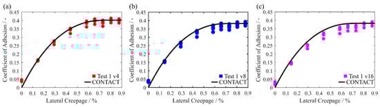 Comparison between the measured lateral creep curves and the numerical lateral creep curves from Kalker’s CONTACT: (a) Test 1 v4; (b) Test 1 v8; (c) Test 1 v16.