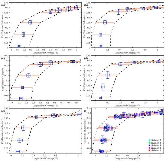 The longitudinal creep curves obtained from Test 2 v8 (under wheel braking) for five rail divisions, as well as a comparison thereof, are shown in Figure 12. The vertical and horizontal error bars denote the variations in the CoA and longitudinal creepage measured in the three repeated cycles at each torque value. The error bar length in the vertical direction corresponds to 20 times the standard deviation of the measured CoA values, while the error bar length in the horizontal direction corresponds to twice the standard deviation of the measured longitudinal creepage values. As in the lateral creep curve, the shaded orange regions corresponding to each datapoint in the longitudinal creep curves represent the expanded uncertainty of that point to 95% coverage, where its width represents uncertainty in the longitudinal creepage measurement calculated via Equations (5), (8), and (10) and its height represents the uncertainty in the CoA measurement, calculated via Equations (13) and (14). The black dashed lines, which connect the corners of the shaded regions, show the bounds of the overall uncertainty of the measured creep curves to 95% coverage. We may notice that the error bar length and uncertainty in the vertical direction are small, again suggesting excellent repeatability in the measured CoA values. Considering the error bar scale in the horizontal direction is 1/10 that of the vertical direction, a larger deviation was observed in the longitudinal creepage measurement in comparison to the CoA measurement, because the accuracy of speed measurement was not as high as that of force measurement. The impact of the uncertainty in the longitudinal creepage measurement on the longitudinal creep curves was more prominent in the lower creepage values (below 0.4%), where the initial points are shifted to the right and the black dashed curves are further apart in the figure.
