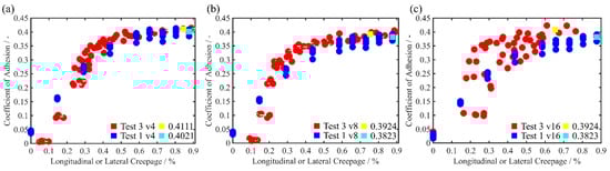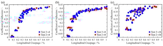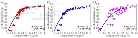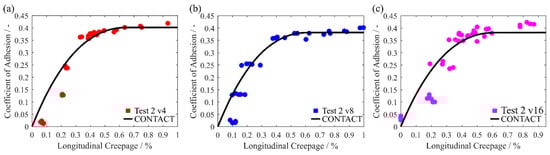 Comparison between the measured longitudinal creep curves from braking tests and the numerical longitudinal creep curves from Kalker’s CONTACT: (a) Test 2 v4; (b) Test 2 v8; (c) Test 2 v16.