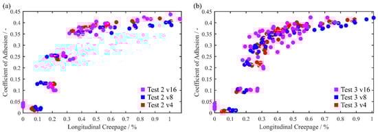 The longitudinal creep curves measured with different speeds are compared in Figure 14 to examine the influence of the wheel rolling speed on the longitudinal creep curve. For both the braking and accelerating cases, shown in Figure 14a and Figure 14b, respectively, we can see that the measured datapoints become more scattered when the speed is increased due to the structural vibrations of the V-Track as mentioned above. We do not see either the CoF or creep coefficient decreasing with the increase in wheel speeds, as observed in the lateral creep curve measurement. Regarding the CoF, this could be because the speed dependence of the CoF usually occurs at high values of the absolute sliding speed (>1 m/s) [], and with the rolling speeds (<16 km/h) and longitudinal creepage values (<1%) used in this study, the absolute sliding speed only reached a maximum of 0.045 m/s. At these levels, the influence of the rolling speed on the longitudinal creep curve may be negligible, as reported in [,]. This leads to an interesting finding that the lateral creep curve could be more sensitive to the influence of the rolling speed than the longitudinal one. Regarding the creep coefficient, since it relies on the accurate measurement of the longitudinal creepage, especially at the low creepage range (<0.4%), it can be further studied in the future with the implementation of a high-precision encoder onto the V-Track.