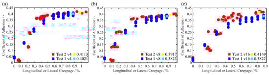 Comparison between the lateral creep curves and the longitudinal creep curves from the accelerating tests across all the tested speeds: (a) 4 km/h; (b) 8 km/h; (c) 16 km/h.