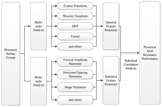 Advancements in non-contact 3D measurement technology and enhanced computational power have facilitated the analysis of 2D and 3D pavement texture profiles, enabling the development of new texture indicators and their correlation with pavement friction. Techniques such as wavelet analysis, Hilbert–Huang Transform (HHT), fractal analysis, power spectral density (PSD), and neural networks have been employed to characterize pavement texture and its impact on friction performance [17,18,19]. Lanruo Zhao [20] et al. obtained the 3D texture information and corresponding PSDs of each pavement, and introduced the pavement’s texture into the friction model. Kane [21] utilized the HHT method to examine the texture–friction relationship, identifying specific parameters derived from texture profile functions as significantly related to friction, thereby endorsing HHT as a viable alternative to traditional methods. Ahmed S. El-Ashwah [22] provides a comprehensive analysis of the HHT technique and compares several texture parameters computed from the decomposed texture profile. B. Kogbara [23] applied close-range photogrammetry (CRP) to measure asphalt pavement texture, focusing on the top 2 mm layer, which demonstrated a stronger correlation with friction. He identified the peak density and peak material volume, particularly Spd, as critical indicators of friction throughout the pavement lifecycle. Kanafi [24] conducted field tests on existing pavements, characterized the changes in macro- and micro-textures under real road conditions, and confirmed their relationship with friction values. Several statistical texture indicators, spectral analysis, and optical simulation images of texture surface height maps were utilized to analyze the macro- and micro-texture evolution and investigate the related physical phenomena. Kanafi concluded that the fractal index Hurst was unsuitable as a pavement texture indicator but identified the top 20% of the PSD as having a stronger correlation with friction [25]. Hu [26] reconstructed 3D macrotexture images using measured data, characterized their 3D features using eight parameters, and statistically analyzed their influence on the dynamic friction coefficient. He discovered that the peak density and arithmetic peak curvature significantly enhanced the dynamic friction coefficient and recommended improving the skid resistance by increasing exposed aggregates and using angular aggregates. Qiang (Joshua) Li [27] evaluated five types of 3D surface parameters to characterize pavement texture properties and established a relationship between friction and these parameters, identifying core material volume and peak density as the most influential factors for both high-speed and low-speed wet conditions. Guoping Qian [28] collected the high-precision texture data of different types of asphalt pavements with different degrees of abrasion. The macro- and microtexture evaluation indexes were obtained after data filtering and separation, and correlation analysis was conducted with anti-skid performance indexes. In summary, the core analytical framework of the statistical model based on texture characteristic parameters can be systematically summarized as illustrated in Figure 1 [29]. The pavement texture evaluation system is categorized, according to the assessment subjects, into 2D evaluation indices derived from profile contours and 3D evaluation indices constructed based on surface texture morphology [30]. Compared with 2D evaluation indices, 3D evaluation indices can more comprehensively characterize the three-dimensional features of pavement texture, and the evaluation results have higher stability. Although the current relevant research achievements can quantitatively analyze the texture of asphalt pavement from different aspects and provide a certain theoretical basis for qualitatively evaluating the surface function of asphalt pavement, there are still problems, such as poor universality and difficulty in the promotion and application of evaluation indices [31]. Therefore, how to solve the universality problem of 3D evaluation indices is the key to promoting the application of 3D evaluation indices for asphalt pavement.
