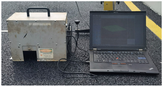 The LS-40 pavement analyzer (Figure 3) is an advanced instrument for texture data acquisition and analysis that incorporates a laser camera module with a line laser and a camera powered by a battery. As shown in Figure 4, the internal motorized table moves the acquisition unit at a predefined speed, utilizing the direct laser triangulation method. The system projects a line laser onto the pavement, scans the selected area, and collects surface data based on the laser triangulation principle. The results are displayed as numerical data and 2D/3D visualizations. The LS-40 captures the high-precision 3D pavement texture data, scanning an area of 10 × 11.5 cm with the lateral resolution of approximately 0.05 mm and a height measurement range of 25 mm. This enables the measurement of features 12.5 mm above and below the surface, with the longitudinal resolution of approximately 0.01 mm. The original data included intensity and range data arrays, each comprising 2448 × 2048 16 bit data points. Notably, LS-40 data collection was unaffected by ambient light sources.