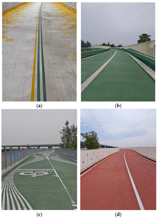 This study assessed the skid-resistance performance of a first-level greenway bridge deck in the Ring City Ecological Park. The evaluation included measurements of the pavement friction coefficient and micro-texture structure. The sampled sections comprised the greenway bridge pavements from Cheng’an-Yu (Ginkgo Bridge), Shaxi Line Bridge (Shaxi·Woye Bridge), Jin Fenghuang Avenue (Xindu·Jin Fenghuang Bridge), and Chengyu (Yurui Bridge), as shown in Figure 5. The field-tested road is a cycling lane, and the pavement material is colored anti-slip mortar paved on an asphalt base course.