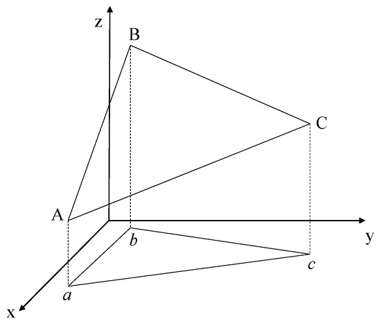 As shown in Figure 6, the projection of spatial triangle ΔABC onto the xoy plane results in triangle Δabc. Assuming the projection planes are the yoz and xoz planes, the respective projections are Δabc′ and Δabc″. The size relationship between ΔABC and its projections is as follows: