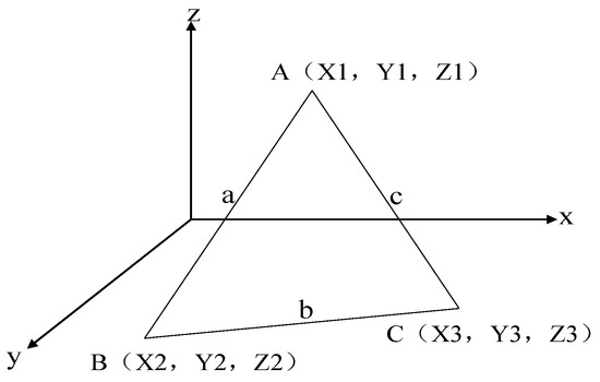 In a 3D space, three points define a plane, and the area of the triangle formed by these points represents the area of the plane. Figure 7 illustrates a spatial plane triangle with sides a, b, and c, and the coordinates of points A, B, and C are (X1, Y1, Z1), (X2, Y2, Z2), and (X3, Y3, Z3), respectively.