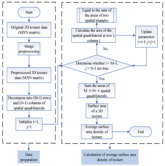 In the data preprocessing stage, this study employed a comprehensive approach combining threshold filtering, median filtering, Gaussian filtering, and dynamic image adjustment with extremum correction to enhance image quality. The 3D pavement texture image represented as an M × N matrix was decomposed into (M − 1) × (N − 1) spatial quadrilaterals because of the high precision of the 3D data collected by LS-40. These quadrilaterals were organized into M − 1 rows and N − 1 columns according to the data characteristics. From a microscopic perspective, the pavement surface texture approximates a 3D spatial surface. Using integration, the area of the 3D surface was approximately the sum of infinitely many small plane areas. Because the three points determine a plane, each quadrilateral can be decomposed into two spatial triangles. Thus, with high-precision data from LS-40, the calculation of the pavement texture surface area can be reduced to solve for the areas of spatial triangles.