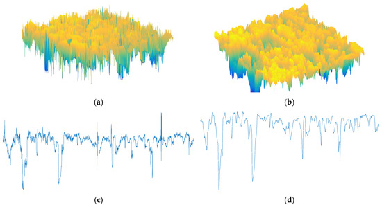 The 3D pavement texture data collected by the LS-40 system were imported into MATLAB R2019a software for the reconstruction of the pavement texture (Figure 9a). However, noise, including specular reflection from the pavement surface sheen and interference from high-frequency electronic equipment, was introduced during data collection. This noise appears as burrs within the red circles in Figure 9a and affected the accuracy of the data, thereby compromising the precision of the image analysis. Consequently, the filtering of the 3D images is necessary to enhance data accuracy.